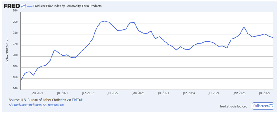 In protein markets, particularly livestock, once breeding stock is liquidated (as it has been over the last several years), the rebuild is slow — measured in years, not quarters — creating a structural floor under supply-driven tightness. In grains, absent a major weather or geopolitical shock, the supply response can be faster, and prices can behave more mean-reverting. There is a scenario where grains could be very strong in 2026 as relatively depressed agricultural commodity prices have asymmetric reward risk should there be weather issues in major growing regions.